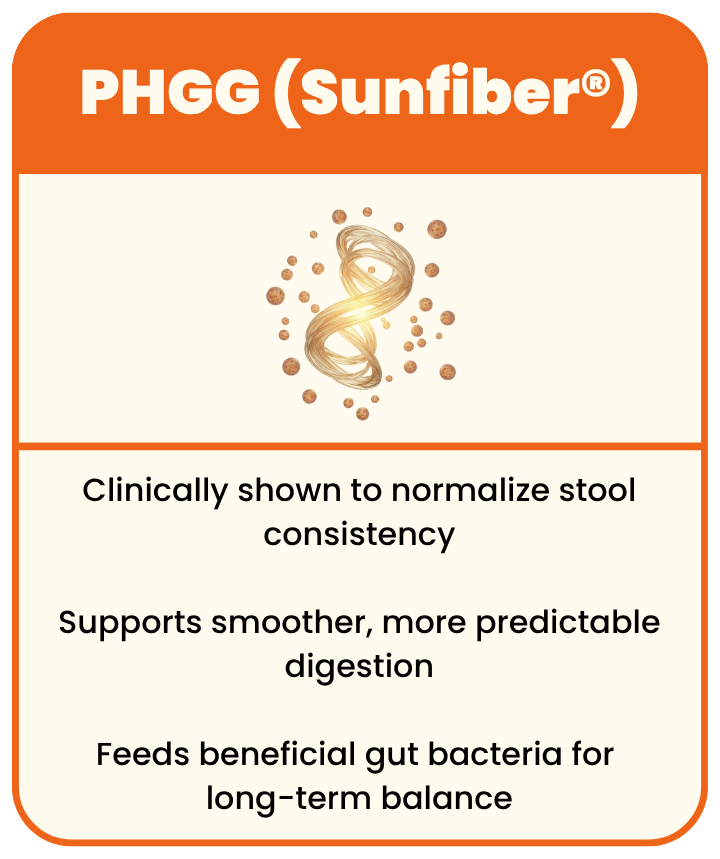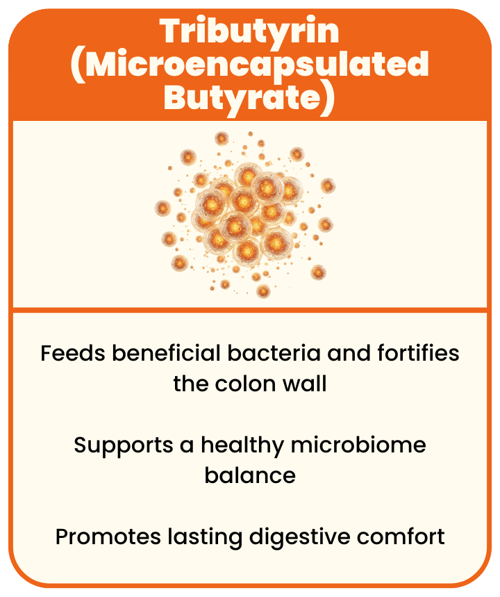 Sunfiber® (PHGG) and Tributyrin (butyrate) feed beneficial bacteria, improve microbial diversity, and promote long-term gut stability — without harsh fibers.