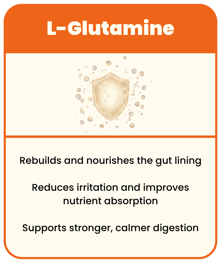 Our formula includes clinically studied gut-rebuilding nutrients such as L-Glutamine, Zinc Carnosine, DGL Licorice, Sunfiber® (PHGG), Tributyrin (butyrate), Ginger, Artichoke extract, NAC, and L-Theanine.