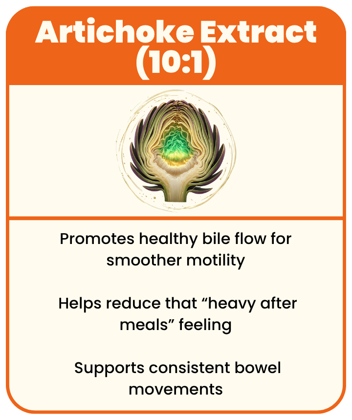 Artichoke and Ginger restart healthy motility, improve bile flow, reduce bloating, and help your digestion move smoothly and efficiently again.